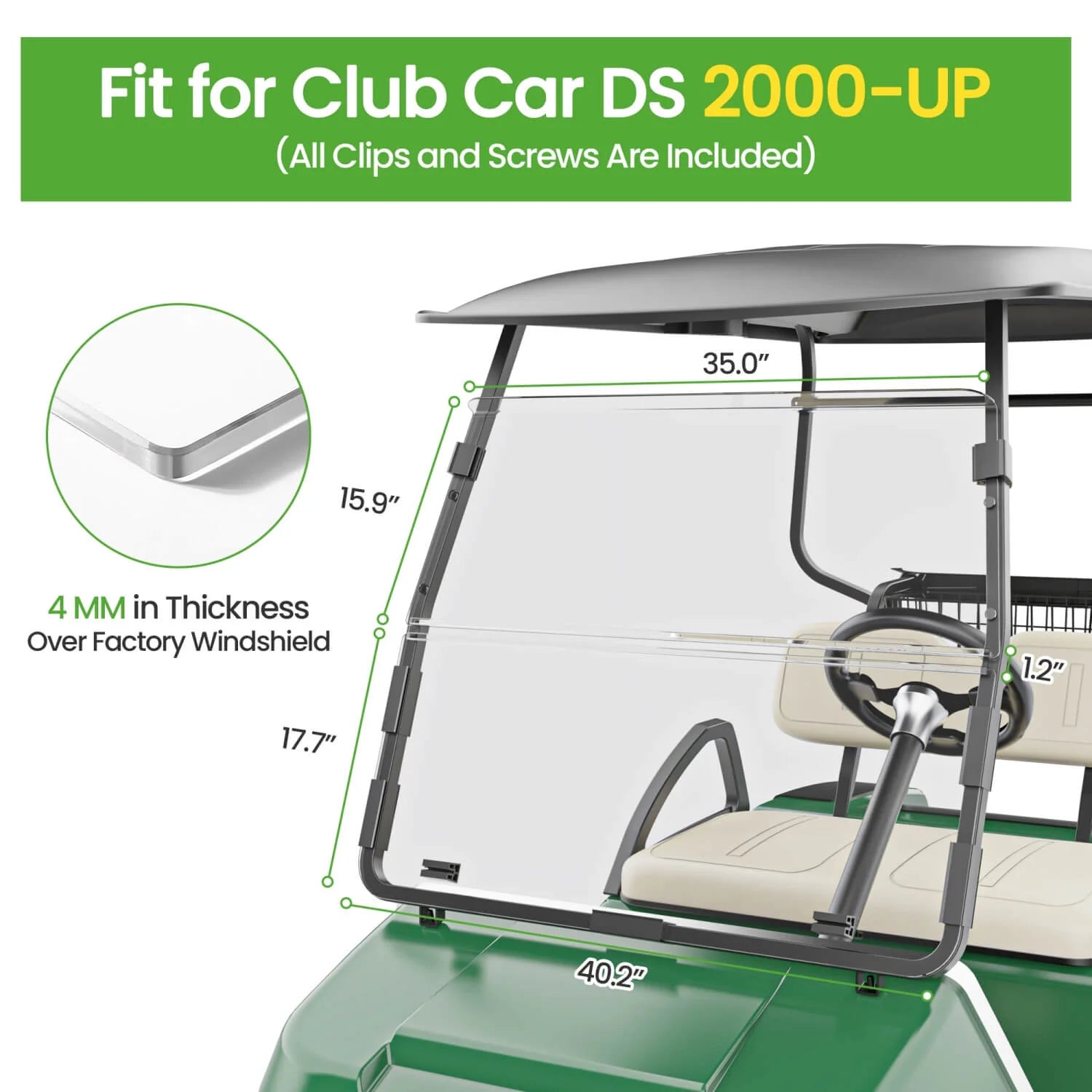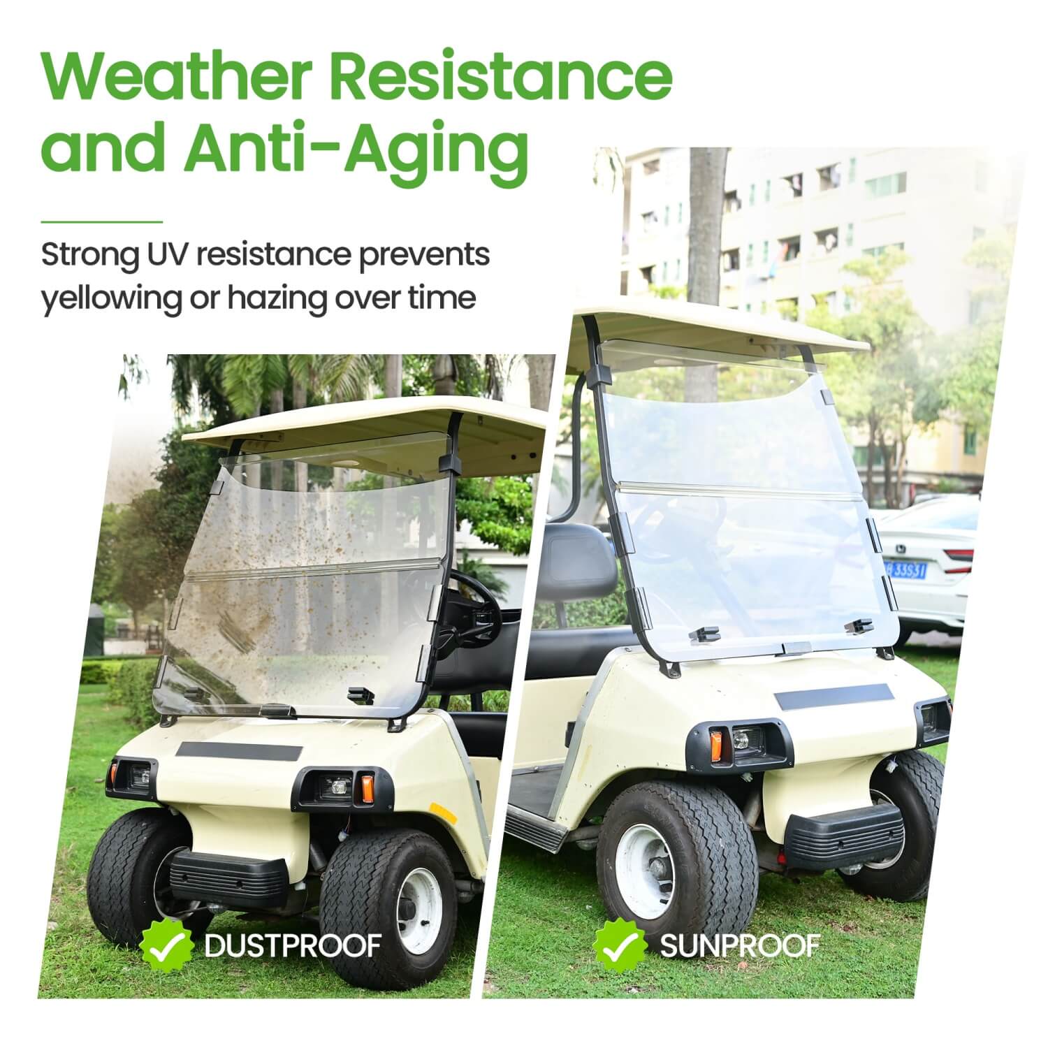 Convenient Fold-Down Function: Features a hinged design that allows the windshield to fold forward flat onto the hood in seconds. This is perfect for loading clubs, fitting into low garages, or enjoying an open-air feel when desired. It locks securely in both the upright and folded positions.