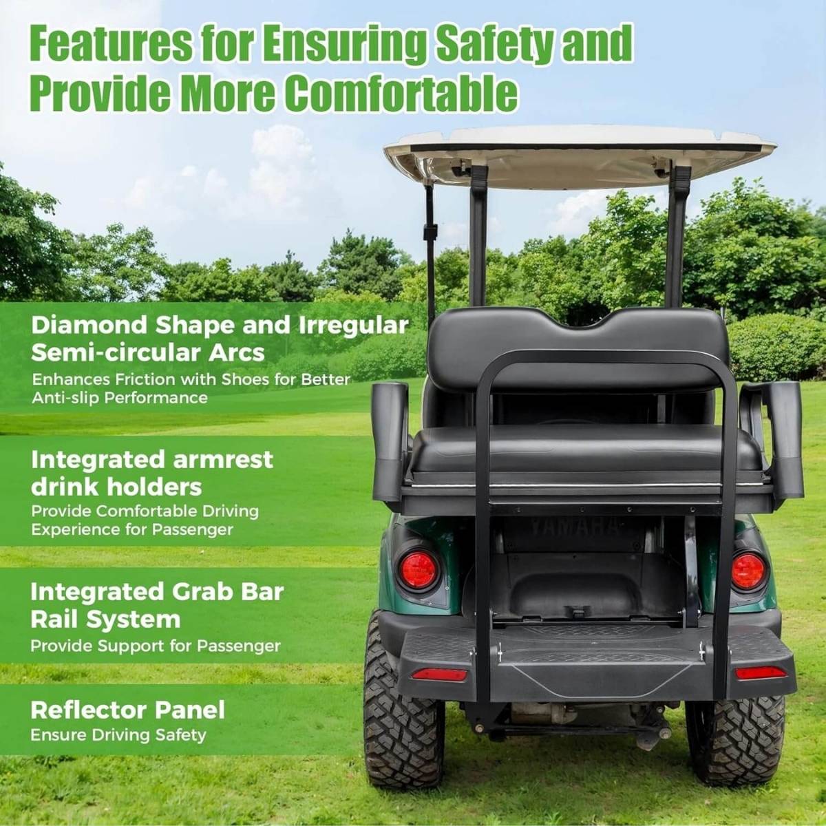 Cargo Mode in Seconds: Simply release the quick-latch pins and flip the entire seat assembly upward and forward, revealing a large, flat, and sturdy cargo bed. Perfect for golf bags, toolboxes, coolers, or landscaping supplies.