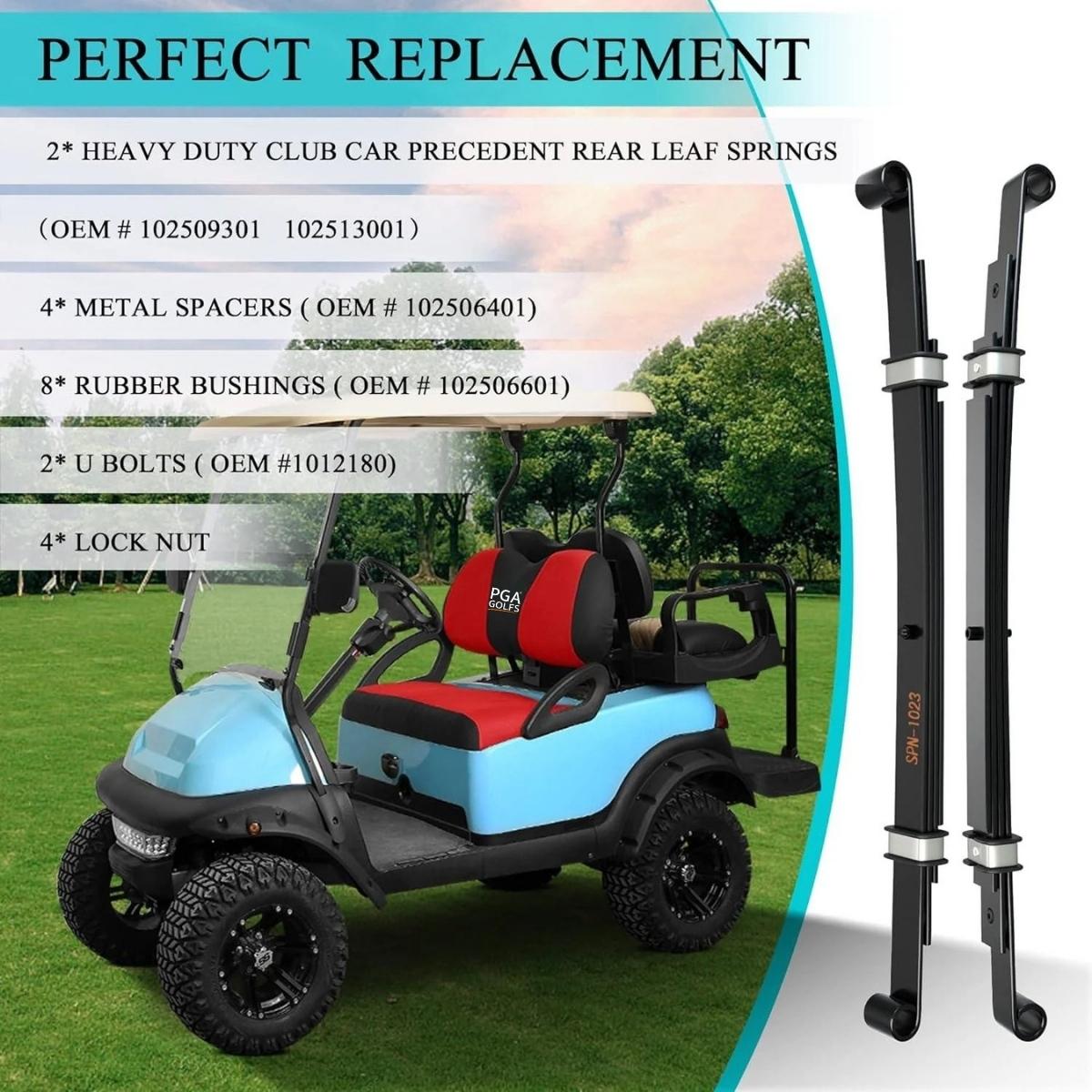 Specifically engineered for the Club Car Precedent platform, this heavy-duty leaf spring kit delivers the perfect balance of ride comfort and load capacity. The progressive leaf design ensures a smooth ride when unloaded while providing firm support under heavy loads. Whether you're maintaining a commercial fleet, using your Precedent for work, or simply want to restore original performance, this kit provides professional-grade results with lasting durability.