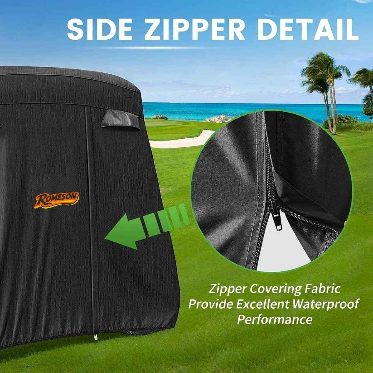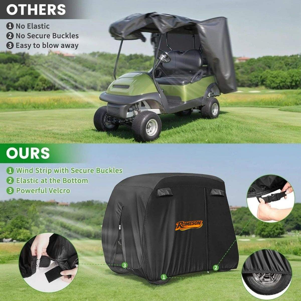 Designed for the contours of most mainstream 2-4 seater golf carts (compatible with most Club Car, EZGO, Yamaha, and other models). The elastic hem and adjustable windproof straps ensure a snug fit that resists being blown off by the wind.