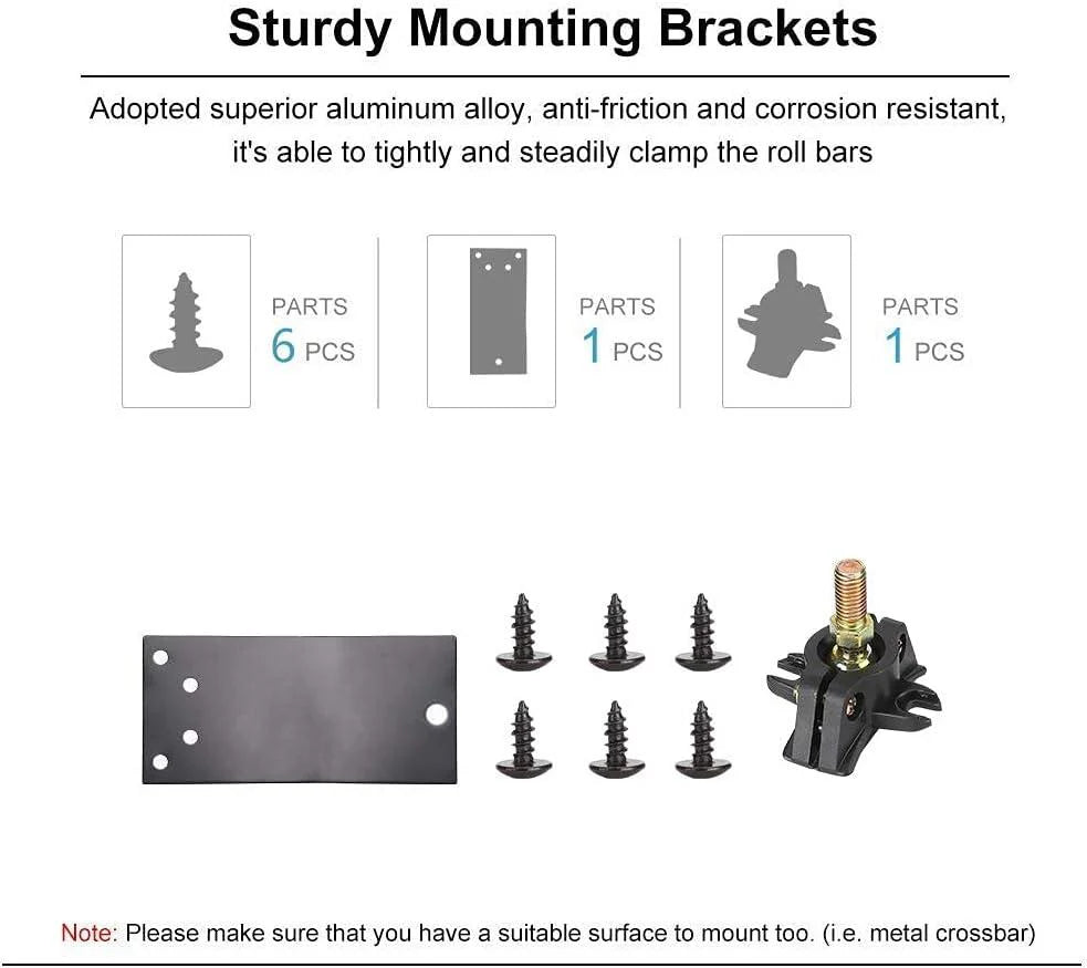 | Mounting | Clamp-on, no-drill (fits 1"–1.5" roll bars) |
