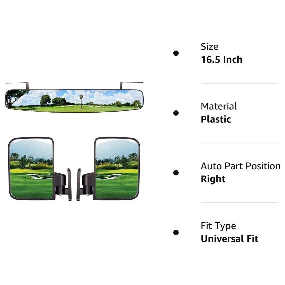 Upgrade your golf cart with the ultimate all-in-one visibility solution. This complete mirror kit includes both universal side view mirrors and a wide rear view mirror, all featuring a convenient foldable design. Engineered for quick, no-drill installation, this set provides 360° of awareness to eliminate blind spots, enhance safety in traffic, and make parking a breeze—whether on the course, in your community, or on the trails.
